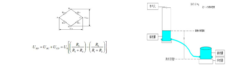 壓阻傳感器采用電阻全橋結(jié)構(gòu),如圖所示:A、C端接直流電源,B、D端為壓阻傳感器輸出的電壓。再通過A/D芯片將輸出的模擬電壓經(jīng)過處理放大轉(zhuǎn)換成數(shù)字信號。MCU采集到相應(yīng)的參數(shù)之后,通過存儲芯片上標(biāo)定系數(shù)擬化出所受壓力值。為保證測量的準確性,在每次測量前調(diào)零使電橋平衡,即使UBD=0。